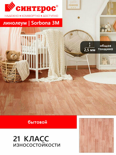 Линолеум Sinteros бытовой Delta Sorbona 3М – это практичное и безопасное покрытие для пола, представляющее собой прекрасное сочетание стоимости и высокого качества. Идеально подходит для использования в жилых помещениях, таких как спальня, гостиная, детская комната и коридор. Главным преимуществом является доступная цена, позволяющая получить качественное напольное покрытие. Обладает высокой шумоизоляцией благодаря своей вспененной основе. Прогнозируемый срок службы составляет около 7 лет. Общая толщина покрытия составляет 2,5 мм, при этом рабочий слой имеет толщину в 0,15 мм, что обеспечивает надежную защиту от износа и повышает стойкость к повреждениям. Материал класса пожарной опасности КМ5. Бытовой линолеум используется для отделки в жилых помещениях с небольшими нагрузками: квартиры, частные дома, дачи. В зависимости от партии тон (оттенок) может отличаться. Линолеум марки Синтерос отличается высоким качеством изготовления, долговечностью и доступной ценой. Именно эти характеристики напольного покрытия делают его одним из самых популярных в своей нише.