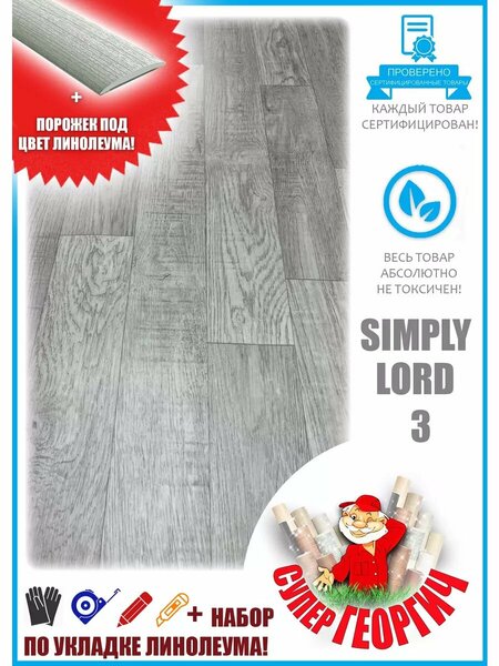 ----------- У площадки действуют ограничения по габаритам доставки на ПВЗ, поэтому рулон линолеума будет упакован в коробку максимального разрешённого размера, тем самым габаритный товар приедет к вам быстро. После получения товара, разложите его в теплом помещении. Инструкция для того, чтобы линолеум принял прежнюю форму будет вложена в коробку. ----------- Линолеум Simply Lord-3 бренда Juteks российского производства, представляет собой прекрасное решение для ремонта эконом. Это покрытие на пол сочетает в себе практичность и удобство. Линолеум на отрез легко укладывается, устойчив к бытовой химии также безопасен для детей и животных. Подложка у данного линолеума войлочная, тем самым данное покрытие на пол теплое и имеет шумопоглащение – 18 дБ. Данное напольное покрытие совместимо с системой теплый пол (до 27 градусов). Общая толщина линолеума – 1,8мм, толщина защитного слоя - 0,15мм. Линолеум для пола имеет легкий рельеф, дизайн - доска / ёлка (размерность дизайна: 9,8/12 х разный размер см). Класс применения – 21. ------- Основные преимущества нашего линолеума в категории напольные покрытия в том, что он представлен в разных размерах, поэтому вы сможете выбрать покрытие в любое помещение.