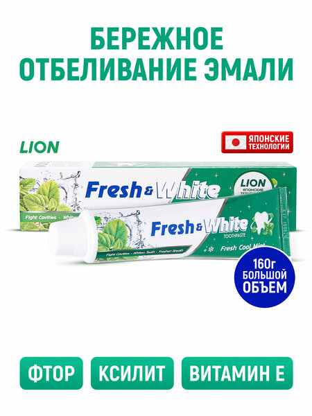 LION Зубная паста отбеливающая Fresh&White для защиты от кариеса, мятная / С фтором, кальцием и ксилитом / Японские технологии, 160 г