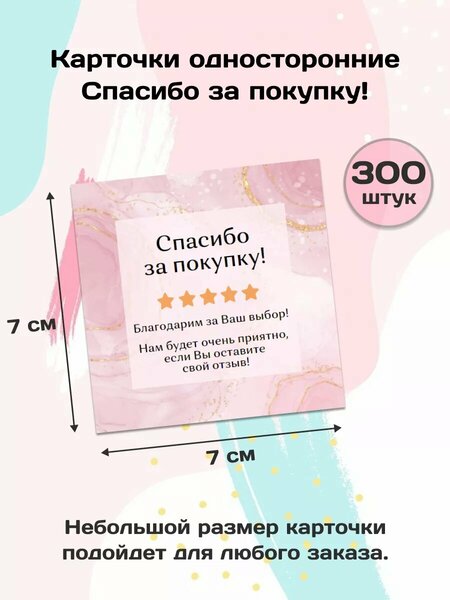 Односторонние листовки (визитки) из плотной бумаги спасибо за покупку (спасибо за отзыв) для клиентов, мотивирующие к написанию отзыва 300 шт. Карточка изготовлена из мелованной бумаги толщиной 170 гр/м. Размер карточки 70х70мм, не большая, квадратная, поместится в любой заказ. Основная задача листовки расположить к себе клиента и подтолкнуть его к написанию положительного отзыва. С такими листовками Ваши товары станут ярче, а положительных отзывов станет значительно больше!