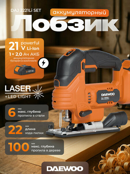 Лобзик аккумуляторный DAEWOO DAJ 2221Li SET — это мощный и функциональный инструмент для распиловки различных материалов. Он оснащён литой алюминиевой подошвой, которая обеспечивает большую механическую прочность и точность выставленных параметров пиления. Лазерный указатель помогает производить разрезы чётко по намеченной прямой линии с минимальной погрешностью. Светодиодная подсветка рабочей зоны делает комфортной работу в условиях ограниченного освещения. Маятниковый ход повышает производительность инструмента и упрощает работу с материалами разной твёрдости. Электронная регулировка оборотов позволяет выбрать оптимальное число оборотов в зависимости от материала. Быстрый зажим пилки экономит время при частой смене полотна, а адаптер пылеотвода даёт возможность подключить пылесос или мешок для сохранения чистоты рабочего места. Пластиковая накладка защищает обрабатываемый материал от образования царапин. Лобзик аккумуляторный DAEWOO DAJ 2221Li SET имеет следующие характеристики: напряжение — 21 В, количество скоростей — 6, материал подошвы — алюминий, ёмкость аккумулятора — 2,0 Ач, число ходов пилки — 800–3800 ход/мин, длина хода пилки — 22 мм, максимальная глубина пропила в стали — 6 мм, в дереве — 100 мм, присутствует возможность регулировки маятникового хода и быстрый зажим пилки.