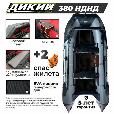 В комплекте с лодкой уже идут + ЭВА-коврик на дно, + носовой тент, + 2 спасательных жилета, + 2 мягкие накладки на сиденье с 2 сумками + Столик О лодке Представляем вашему вниманию лодку ПВХ Дикий 380 нднд с надувным дном низкого давления умеренной килеватости — превосходный выбор четырехместной лодки под мотор для рыбалки, охоты, отдыха на природе с семьей и увлекательных путешествий. *** *** Основные характеристики == Длина лодки: 380 см Ширина лодки: 175 см Диаметр баллонов: 48 см Высота транца: 381 мм Грузоподъемность: 650 кг Киль лодки: есть Пассажировместимость: 4 Тип лодки: 4х местная *** *** Надувное дно НДНД *** Количество перегородок: 8 шт. Стравливающий клапан: ДА Килеватость: умеренная Тип швов: двойные *** *** Транец и мотор *** Под мотор: 25 л. с. Толщина транца: 27 мм Сливной клапан: есть *** *** Броня *** Бронированные борта: ДА Бронированный киль: ДА Бронированный транец лесенкой: ДА *** *** Обвесы *** Рым-ролик: ДА Рым-ручка: ДА Леерный пояс: ДА Бортовые леера: ДА Кольца для крепления вещей: 5 шт. *** *** Заводской тюнинг *** Держатели вещей: ДА Держатели снастей: ДА Носовой отсек: ДА Крепление бака: ДА Держатель эхолота: ДА *** *** Комплектация лодки == - сумка для переноски лодки - 2 весла - 2 сиденья - 2 мягкие накладки + 2 сумки под накладку - насос 5 л. - ремонтный набор - чехол ремонтного набора - паспорт
