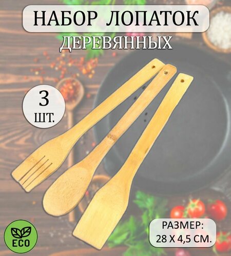 Деревянная кухонная лопатка - очень удобный аксессуар, который поможет вам в приготовлении пищи и не испортит вашу посуду. Набор лопаток имеет теплый оттенок, они эстетичны и приятны на ощупь. Лопатки из натурального дерева обладают низкой теплопроводностью, что исключает возможность получения ожога. Изделия гипоаллергенны, экологичны, полностью безопасны для здоровья, подходят для антипригарных покрытий. Размер: 28 х 4,5 см. В наборе 3 предмета: лопатка классическая, лопатка с прорезями, лопатка-ложка.
