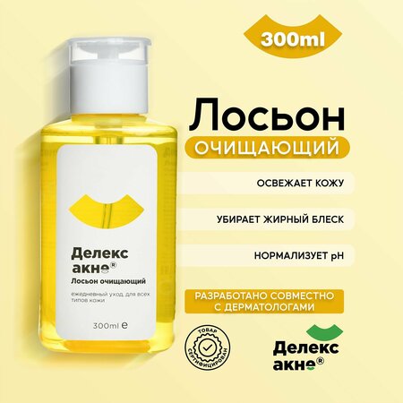 Очищающий лосьон для лица Делекс - Акне применяется для ежедневного ухода за кожей лица и тела любого типа, в том числе нормальной и жирной, а также склонной к угревой сыпи. Тоник для лица от прыщей выпускается в удобной упаковке объемом 300 мл. Уходовая косметика для чистки лица убирает жирный блеск, нормализует pH. Косметическое средство не содержит гормонов и антибиотиков, отличается уникальным составом. В его основе находятся растительные экстракты, ментол и лимонная кислота. Несмываемый лосьон обеспечивает глубокую чистку, оказывает выраженное успокаивающее действие. Универсальное средство предназначено для очистки, комбинированной, жирной и нормальной кожи, способствует устранению прыщей у девушек и парней - подростков, замедлению возрастных изменений у взрослых женщин и мужчин. Лосьон оказывает матирующий, освежающий, противовоспалительный эффект, способствует восстановлению нормального состояния проблемных зон, уменьшению воспаления и раздражения. Лосьон для лица станет лучшим подарком на день рождения для мамы, дочки - подростка и любимой девушки. Основное действие