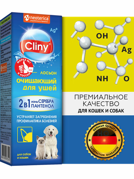 Лосьон для ушей собак и кошек Клини 50 мл Кажется, что наши питомцы справляются сами с уходом за ушами. Однако домашняя пыль, загрязнённый городской воздух и низкая влажность в квартирах плохо влияют на уши. Частички пыли оседают на ушной раковине, провоцируют образование густой ушной серы — питомцу сложнее ухаживать за собой, ушная сера скапливается, может возникать раздражение. Даже здоровые уши нуждаются в дополнительном уходе. А если у вашего питомца наблюдается активное выделение ушной серы — гигиенические обработки глаз должны быть регулярными. Для ухода за ушами питомца используйте лосьон для ушей Cliny.Cliny — это первая серия по уходу за животными с ионами серебра. Ионы серебра обладают мощным бактерицидным действием широкого спектра, не вызывают аллергии. Cliny — и гигиена, и профилактика болезней. Лосьон для ушей Cliny подходит для регулярного ухода за ушами питомца и легко удаляет даже засохшие корочки. Большой флакон и стеклянная пипетка делают его экономичным и удобным в использовании. Лосьон имеет приятный запах и не оставляет масляных пятен. Лосьон для ушей Cliny:✔ Бережно устраняет загрязнения и выделения✔ Снимает зуд и раздражение✔ Профилактирует болезни ушей✔Смягчает кожу ушного прохода✔ Снижает риск инфекционных заболеваний✔ Не оставляет масляных пятенИспользуйте лосьон для ушей Cliny:✔ Кошкам и собакам✔ Кроликам и хорькам✔ 1–2 раза в неделю для гигиеныАктивные компоненты:● Ионы серебра обладают бактерицидной активностью● Яблочная кислота обладает противоспалительным и противоотёчным действием● Бензаклония хлорид проявляет антисептическое, противогрибковое действие● Пантенол заживляет и смягчает кожу● Экстракты алое вера и ромашки обладают противовоспалительным, увлажняющим, успокаивающим и регенерирующим действиемПорядок применения: Закапайте 3–5 капель лосьона в ухо животному и круговыми движениями помассируйте основание ушной раковины. Затем ватным тампоном, смоченным в лосьоне, протрите внутреннюю поверхность ушной раковины и наружный слуховой проход. Состав разработан компанией Neoterica (Германия).