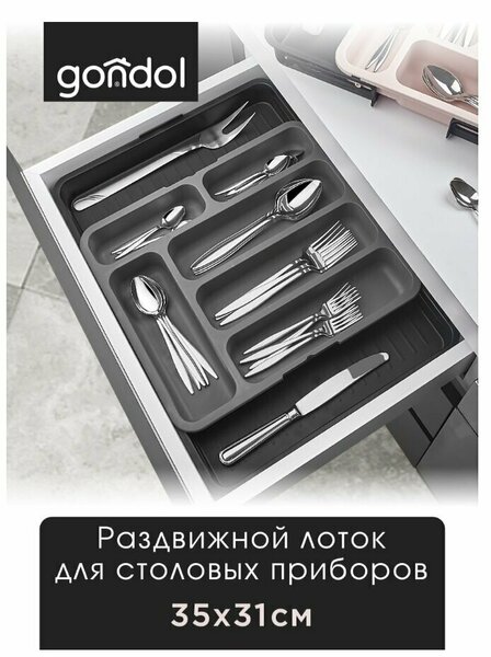 Раздвижной лоток для столовых приборов и позволит организовать хранение столовых приборов в кухонных ящиках разных размеров. Ширина может быть 31 см (дополнительные секции закрыты), 42 см (открыта одна дополнительная секция) и 53 см (открыты обе дополнительные секции. Классический дизайн впишется в любой гарнитур. Лоток для столовых приборов – это полезный аксессуар для кухонного ящика, обеспечивающий удобное хранение столовых приборов. Простой и стильный дизайн делает его отличным дополнением кухонного интерьера. Изделие раздвижное, что позволяет приспособить его к размеру кухонного ящика. Лотку не нужен специальный уход. Лоток для столовых приборов выполнен из прочного пластика высокого качества. Деление на пять отсеков позволит удобно расположить предметы в ящик, отделив их друг от друга. Также лоток раздвижной позволяет отрегулировать размер, чтобы полностью использовать полезное пространство кухонного ящика.