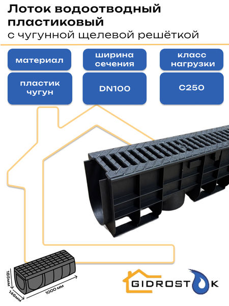 Лоток пластиковый DN100 H185 мм с чугунной щелевой решёткой и крепежом класс С250