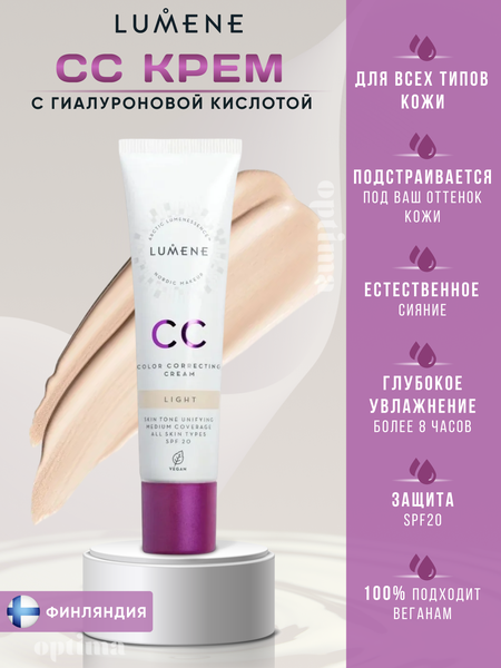 Невесомое, но при этом стойкое тонирующее средство cc cream lumene Абсолютное совершенство для безупречного покрытия. Подстраивается под ваш оттенок кожи, и придает естественное сияние. Может использоваться самостоятельно или как база под макияж. Обеспечивает уход за кожей и защиту. Он ложится на лицо равномерным слоем, скрывая недостатки кожи, выравнивает тон и рельеф кожи, маскирует покраснения, черные точки. Формула CC Color Correcting Cream включает брусничный экстракт и кристально чистую воду из Арктики. CC крем преображает кожу, возвращая ей упругость и здоровый цвет. Клинические исследования показали, что увлажняющий эффект продукта длится более 8 часов. СС крем с SPF 20 защищает кожу лица от вредного воздействия ультрафиолетовых лучей. СС крем для лица подходит для всех типов кожи. CC-крем LUMENE является оригинальной финской косметикой. LUMENE является оригинальной финской косметикой. Косметика и ее компоненты не тестируются на животных. Все продукты по уходу за кожей и тональные средства на 100 % подходят веганам. Естественное сияние и свежесть, оптимальное увлажнение и защита кожи — основа ритуалов красоты от Люмене. В своем подходе Lumene сохраняют верность финскому наследию, но при этом близки женщинам во всем мире, вне зависимости от их возраста, типа и тона кожи. Философия Lumene уходит корнями в обычаи и традиции Финляндии. Страны, чьи ритуалы красоты тесно связаны с тем, как женщины взаимодействуют с окружающей их, всеобъемлющей природой и уникальным солнечным циклом. Lumene - естественный, аутентичный и непринужденный подход к красоте. Продукцию Lumene вы можете найти в нашем магазине по привлекательным ценам.