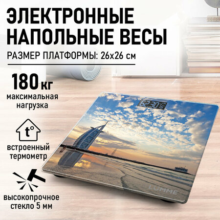 Весы напольные электронные стеклянные с термометром, размер весов 26*26 см, Дисплей светодиодный (LED). Диапазон измерений 5-180 кг. Максимальная нагрузка 180 кг. Точность измерения 50 г. Индикация заряда батареи. Индикация перегрузки. Измерение температуры воздуха. Изменение единиц измерения. Единицы измерения кг и фунты. Светящиеся символы дисплея. Тип элементов питания AAA. Количество элементов питания 2. С рисунком на корпусе. Автоматическое включение. Автоматическое выключение. Материал платформы стекло. Электронные напольные весы с платформой из прочного полированного стекла с закругленными краями, встроенной функцией индикации температуры помещения и жидкокристаллическим дисплеем с легко читаемыми цифрами. Весы обеспечивают взвешивание до 180 килограммов с точностью до 50 граммов и способны работать в различных единицах измерения. Цифровой дисплей, индикаторы перегрузки и замены батареи, включение от прикосновения, а также функция автоматического обнуления и отключения подарят наибольший комфорт при использовании весов и надолго сохранят заряд батарейки.