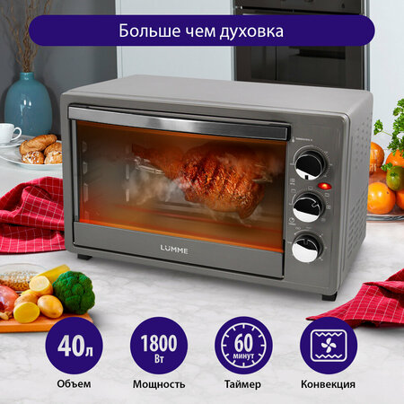 Мини-печь с конвекцией, Грилем + вертел, объем камеры 40 литров, Мощность 1800 Вт, Верхний гриль, Верхний нагрев, Верхний+нижний нагрев, Конвекция, Нижний гриль, Нижний нагрев, Поддержание температуры, Термостат, Таймер от 5 до 60 мин, Материал корпуса металл/пластик, Материал дверцы закаленное стекло/металл, Количество противней в комплекте 1, Максимальная температура нагрева 230°C, Минимальная температура нагрева 70°C, Объём 33 л, Сигнал об окончании приготовления, Индикатор работы, Автоматическое выключение, Управление механическое, Держатель для противня/решётки, Поддон для сбора крошек, Решётка, Длина сетевого шнура 0,7 м. Вместительная камера объемом 40 литров позволит одновременно готовить несколько блюд и вмещает продукты большого размера, таких как целая тушка птицы, большой мясной рулет или пирог для всей семьи. Режим конвекции избавляет от необходимости перемещения блюда и противня во время приготовления, так как обеспечивает постоянную циркуляцию горячего воздуха по всей внутренней камере, за счет чего достигается одинаковая температура нагрева блюда со всех сторон, что позволяет пище запекаться и покрываться румяной корочкой равномерно по всей поверхности. Встроенный таймер позволит с легкостью отслеживать время приготовления блюд, при этом, Вы сможете отвлечься на другие дела, так как по истечении установленного времени, духовой шкаф выключится автоматически, а звуковой сигнал об окончании приготовления напомнит о готовности блюда. Надёжные компоненты прибора обеспечат длительный срок службы и бесперебойную работу. Аксессуары в комплекте: вертел, противень с антипригарным покрытием, решетка, ручка для извлечения противня/решетки, ручка для вертела, поддон для сбора крошек. Электрический духовой шкаф LUMME – Ваш отличный помощник на кухне, используя который станет просто и приятно радовать себя и своих близких вкусными горячими блюдами!
