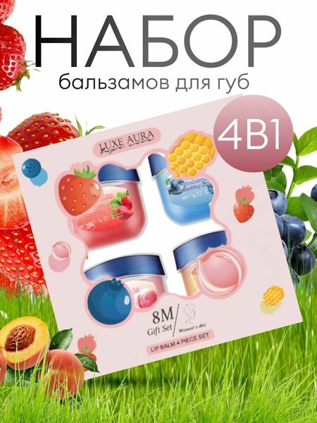 Набор бальзамов для губ LUXE AURA. Позаботьтесь о своих губах с изысканным набором LUXE AURA! Этот великолепный набор обеспечит вашим губам нежность и комфорт в любое время года, делая их мягкими и ухоженными. Что входит в набор: - 4 стильных тюбика бальзамов для губ, каждый с уникальным ароматом, который подчеркнет вашу индивидуальность. - Бережный уход: Формула, обогащенная витаминами E и C, и натуральными маслами, такими как масло ши и жожоба обеспечит глубокое увлажнение и восстановление. - Эффективная защита: Бальзамы защищают губы от ветра, холода и солнечных лучей благодаря SPF 15. Преимущества: - Приятные ароматы, дарящие ощущение свежести и комфорта на весь день. - Насыщенная питательная формула, которая проникает в глубокие слои кожи, увлажняя и питая губы. - Стильное и удобное оформление: Компактные тюбики легко помещаются в сумочку, косметичку или карман, чтобы вы могли ухаживать за губами на ходу. Почему выбрать LUXE AURA: - Идеально для повседневного ухода: Используйте утром и вечером, чтобы губы всегда оставались мягкими и гладкими. - Отличный подарок: Роскошная упаковка делает набор прекрасным подарком для любимых людей на любой праздник или просто в знак внимания. - Для любого сезона: Независимо от времени года, ваши губы будут надежно защищены и красивы. Позаботьтесь о себе и своих близких с набором LUXE AURA! Подходит для любого повода и подчеркивает вашу утонченность и заботу о себе