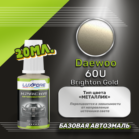 Базовая автоэмаль Luxfore в подкраске с кисточкой объемом 20мл, по цветовому каталогу Daewoo, цвет 60U Brighton Gold. Премиальная автомобильная краска, обладает высокой укрывистостью и скоростью сушки, что позволит вам: быстро и качественно провести предпродажную подготовку автомобиля, а также выполнить небольшой ремонт лакокрасочного покрытия самостоятельно. Примечание: Внимание! Все базовые автоэмали, не покрытые автомобильным лаком имеют тусклый матовый цвет, а также подвержены воздействию окружающей среды. Помните, что базовые автомобильные краски необходимо обязательно покрывать автомобильным лаком для защиты от воздействия окружающей среды, а также получения законченного глянцевого вида.