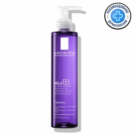 Микро-пилинг гель для коррекции гиперпигментации чувствительной кожи лица и тела. Мягко очищает кожу и заметно выравнивает ее тон и текстуру. Корректирует все виды пигментации - пигментные пятна, связанные с воздействием УФ-лучей или возрастными изменениями, пятна постакне, тусклый цвет и неровный тон кожи, веснушки. Подходит для умывания всех типов кожи - чувствительной, нормальной, жирной, сухой и комбинированной. Применяется всесезонно как осветляющий, отбеливающий кислотный пилинг для выравнивания тона кожи. Протестировано под контролем дерматологов и офтальмологов. Эффективность подтверждена клиническими исследованиями. Результат применения: тон кожи выглядит более ровным через 5 недель, пигментные пятна видимо сокращены (клиническое исследование, 49 респондентов, 5 недель). Mela B3 – Мела Б3 применение: Нанесите на влажную кожу нежными массирующими движениями, затем тщательно смойте водой. Подходит для ежедневного использования утром и вечером. В случае попадания в глаза немедленно промойте их водой. Для снятия макияжа с глаз используйте мицеллярную воду. Активы: меласил – инновационный компонент для коррекции и предотвращения пигментации ниацинамид – для коррекции стойких пигментных пятен PHA-кислота – мягко отшелушивает верхний слой и ускоряет обновление клеток кожи Состав: aqua, glycerin, coco-betaine, propanediol, sodium cocoyl glycinate, peg-120 methyl glucose dioleate, sodium hydroxide, sodium chloride, citric acid, gluconolactone, ceramide np, niacinamide, 2-mercaptonicotinoyl glycine, sodium thiosulfate, disodium edta, capryloyl glycine, caprylyl glycol, trisodium ethylenediamine disuccinate, pentylene glycol, acrylates copolymer, tocopherol, tocopheryl acetate, parfum.