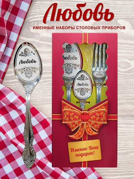 Самое значимое слово для каждого человека - это его собственное имя! Именные подарки воспринимаются с особым восторгом как женщинами, так и мужчинами, независимо от возраста. Столовые приборы с лазерной гравировкой из серии "Женские имена" от бренда "Ваш подарок" это уникальный подарок для любимой девушки, женщины, жены, подруги, сестры, коллеги, дочки, внучки и племянницы. Набор именных столовых приборов состоит из 3 предметов: столовая ложка, чайная ложечка и вилка. Вилка и ложки с именем изготовлены по госту из высококачественной нержавеющей стали AISI 430, предназначенной для пищевых целей, толщиной 2 мм.