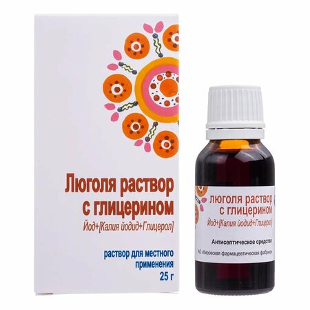 Действующее вещество: Йод - 1 г Вспомогательные вещества: Калия йодид - 2 г Глицерол - 81 г Вода очищенная - 16 г