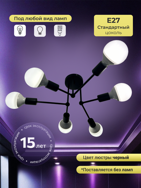 Купить люстру LEDCITY — лучший выбор для дома! Размеры: Ø460*230 мм, основание 120 мм, крепёжная планка п-образная 115 мм. Современная потолочная люстра подойдёт для кухни, гостиной, детской или спальни. • Рассчитана на шесть ламп, допустимая мощность одной лампы не более 60Вт, в целом не более 360Вт, способна осветить комнату до 18кв. м • Тип цоколя Е27, совместима со светодиодными, люминесцентными и лампами накаливания. • Управляется выключателем. Важно! Поставляется без ламп. Люстра черного цвета впишется в современный стиль, лофт или хай-тек. • Металлический корпус защищает от перегревания • Лёгкая установка на планку (все крепежи комплекте) Люстра недорого от производителя гарантирует качество товара и высший сервис: • Гарантия 1 год; • Персональная техподдержка Инструкция есть в коробке. Контакты поддержки указаны в паспорте товара и на наклейке, внутри люстры.