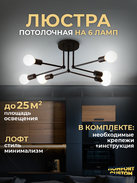 Люстра на 6 лампочек в стиле минимализм. Однотонность и лаконичность такой люстры помогут легко вписаться в ваш интерьер. Конструкцией не предусмотрены плафоны, а значит можно использовать дизайнерские лампочки с интересной нитью накаливания. Изначально, провода каждой планке не соединены друг с другом, а значит люстру можно использовать на 1,2 или 3 выключателя. Сами лампочки в комплект не входят. Для люстры подойдут лампочки с цоколем Е27. В комплекте есть инструкция, по которой вы легко соберете и установите люстру. Так же в комплект входит крепежная планка и дюбеля с саморезами для ее установки. Стильный светильник с площадью освещения 25м2. Наш потолочный светильник идеально впишется в любой интерьер, чаще всего его используют для: Hi-tech, скандинавский стиль, лофт, модерн, минимализм, неоклассика и современный стиль. Подойдет на кухню, коридор, прихожая, ванную. Можно использовать в спальне, для зала, гостиную, детскую. Так же подойдет в комнату, гостиная, в прихожую, приходая как часть интерьер для дома или комнаты. Установить можно на обычный, стандартный потолок, а так же подойдет для натяжных потолков. Подвесная Как осветитель аксессуары для уюта в доме интерьерный декор на потолок. Наслаждайтесь современным дизайном и приятным светом.