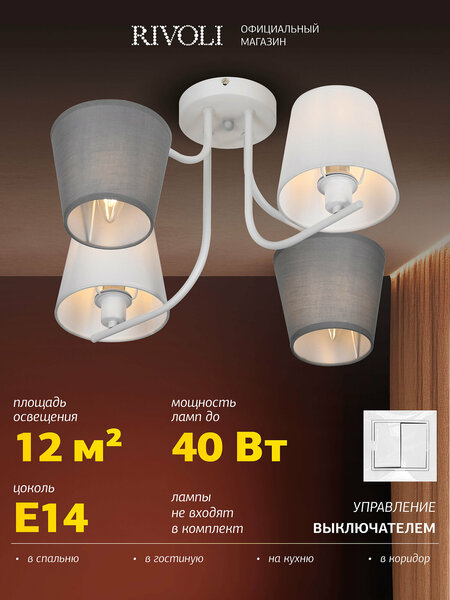 Rivoli Chris стильный и современный потолочный светильник с плафонами под лампочки с цоколем E14, максимальной мощности 40 Вт. Отличительная особенность данной люстры - чередование прямых и перевернутых плафонов двух цветов серого и белого, изготовленных из качественной ткани. Внутренний слой - из светотехнического пластика, внешний слой - из красивой износостойкой ткани с пылеотталкивающими свойствами. Для более точной цветопередачи смотрите фото в карусели с выключенным светом. Рекомендуемая площадь освещения составляет 12 кв. м. Равномерное распределение света создает комфортное и уютное освещение. Универсальное крепление позволяет устанавливать светильник на разные поверхности, включая бетон, дерево, натяжные и гипсокартонные потолки. Это расширяет возможности дизайна и оформления, позволяя подобрать оптимальный вариант освещения для дома или офиса. Обратите внимание, что лампочки в комплектацию не входят, для данного светильника необходимо приобрести 4 лампы. Для лучшей энергоэффективности рекомендуем использовать светодиодные LED лампы.