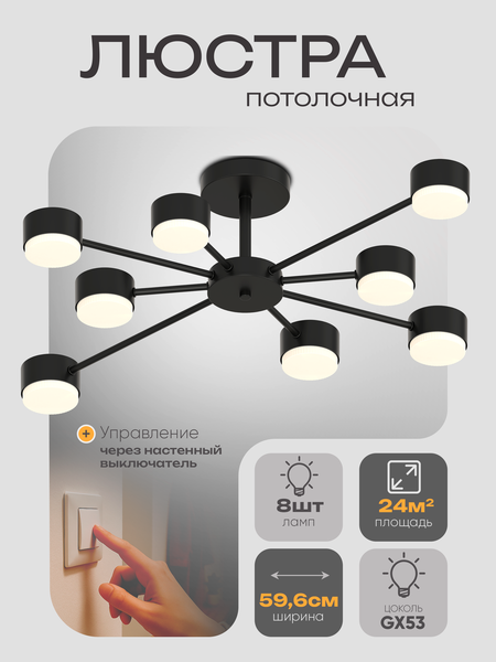 Подарите своему интерьеру ноту современной изысканности и уютного комфорта с нашей потолочной люстрой! Это не просто источник света, а практичное и эстетически безупречное решение, созданное для гармоничного дополнения вашего пространства и формирования атмосферы истинного отдыха. Почему именно эта люстра станет идеальным выбором? Абсолютная Универсальность Стиля: Ее легкий и изящный дизайн – воплощение современной лаконичности. Отсутствие лишнего декора делает люстру визуально воздушной, добавляя помещению ощущение простора и света, даже в компактных комнатах. Классический черный цвет – синоним изысканности и универсальности. Он станет элегантным акцентом и идеально впишется в ЛЮБОЙ интерьер – от строгой гостиной и уютной спальни до динамичной детской или стильной прихожей. Черный тон создает выразительный контраст, подчеркивая красоту вашего декора и усиливая общее впечатление от оформления. Идеально Сбалансированное Освещение: Люстра оснащена 8 патронами GX53. Эта конструкция дает вам полную свободу в создании атмосферы! Хотите яркий свет для работы или вечеринки? Или предпочитаете мягкое, расслабляющее свечение для отдыха? Выбирайте лампы нужной мощности и цветовой температуры под настроение и назначение каждой комнаты. Оптимальная освещенность гарантирована. Простота и Надежность Монтажа: Забудьте о сложных установках! Люстра легко монтируется и подключается. Универсальное крепление (планка 11.5см) делает ее совместимой со всеми типами потолков, включая стандартные, низкие и даже деликатные натяжные конструкции. Быстро, удобно, без лишних хлопот. Гарантия Качества и Безопасности: Мы ценим ваше спокойствие. Люстра изготовлена из высококачественных, экологичных материалов. Полное соответствие строгим стандартам безопасности и экологичности – обязательное условие для комфортной и беззаботной эксплуатации в вашем доме. Практичные Детали: Габариты: 72*46 см (диаметр/длина) х 19 см (высота). Диаметр основания: 12 см. Тип крепления: Планка 11.5см. Тип цоколя: 8 x GX53. Дополнительное Преимущество: Наш ассортимент богат разнообразием! Мы предлагаем люстры в различных цветах и стилях, чтобы вы могли найти идеальный светильник, отражающий вашу индивидуальность и вкус. Инвестируйте в атмосферу! Наши стильные и функциональные люстры – это не просто освещение, это ключ к созданию гармоничного, красивого и невероятно уютного пространства, где вы будете чувствовать себя комфортно каждый день. Преобразите свое пространство с элегантной легкостью! Выберите идеальное освещение сегодня!