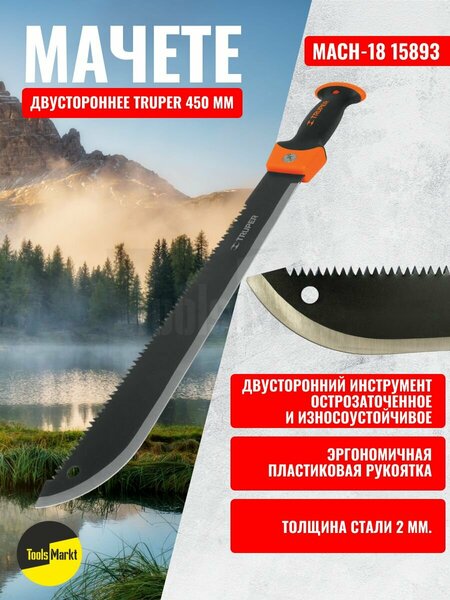 Мачете двустороннее 450 мм. Truper MACH-18 15893 представляет собой длинный нож для вырубки густых зарослей, кустарника, небольших веток. Позволяет освобождать тропинки, выполнять мелкие лесозаготовительные работы. Мачете двустороннее 450 мм. Truper MACH-18 15893 имеет мексиканское происхождение и традиционно используется для уборки сахарного тростника и расчистки пути в джунглях. Данная модель имеет двустороннюю заточку. С одной стороны располагается гладкое лезвие, а с другой - полоса с зубчиками, способная выполнять функции садовой пилы. Благодаря эргономичной рукоятке мачете удобно лежит в руке и не будет выскальзывать в процессе работы. Преимущества Truper MACH-18 Долгий срок службы; Надежность; Износоустойчивость; Острозаточенные лезвия; Стальное лезвие толщиной 2 мм. Не является холодным оружием.