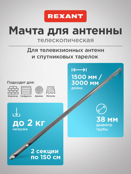 Мачта стальная телескопическая Крым-3 Rexant 300 см для крепления антенны, спутниковых тарелок и роутеров на кронштейн