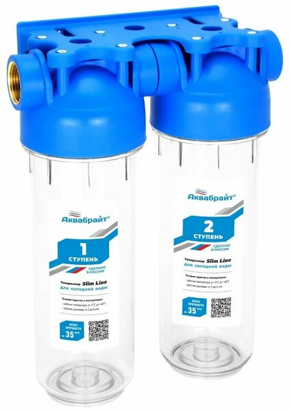 Магистральный фильтр аквабрайт модель АБФ-2 3/4 изготовлен из усиленного полипропилена. ► характеристики • Диаметр подключения: 3/4 дюйма (26 мм); • Типоразмер картриджа: Подходит для картриджей фильтра Slim Line 10 дюймов (высота - 254 мм ± 1 мм); • Рабочая температура воды: От +2° до +45°С, подходит для большинства бытовых и коммерческих применений. • Давление разрушения: До 35 атм, что говорит о высокой прочности и устойчивости к давлению. • Рабочее давление: 2-8 атм, покрывает стандартный диапазон давления в бытовых водопроводных системах. • Производительность: До 10 литров в минуту; • Размеры: Высота 324 мм, ширина 230 мм, глубина 110 мм. ► какие катриджи подойдут? Оригинальные аквабрайт с типоразмером для фильтра Slim Line 10 дюймов: А) Для механической очистки воды серии ПП, ВП, ГП, А. Б) Для сорбационной очистки серии комби, УГП, УГА. В) Для умягчения воды или удаления железа серии ФП, С, КФС. ► назначение Фильтр устанавливается в водопроводную магистраль и предназначен для очистки холодной воды. Эффективно удаляет различные примеси благодаря возможности использования двух разновидностей картриджей с типоразмером Slim Line 10 дюймов. Особенно рекомендуется для предварительной очистки воды. Конструкция с прозрачным корпусом позволяет легко контролировать состояние картриджа и определить момент его замены. Фильтр изготовлен из усиленного полипропилена, что обеспечивает его прочность и долговечность. Оптимально подходит для использования в бытовых условиях благодаря своей производительности и универсальному диаметру подключения. Рекомендуется для предварительной очистки воды. ► конструктивные особенности • Прозрачный корпус: Позволяет легко наблюдать за состоянием и загрязнением картриджа, упрощая техническое обслуживание и своевременную замену фильтрующего элемента. • Латунные вставки в резьбовых соединениях: Обеспечивают дополнительную прочность соединений, повышают их износостойкость и долговечность, предотвращая протечки. • Кронштейн, прикручиваемый винтами к крышкам фильтра: Улучшает надежность крепления фильтра, обеспечивая его стабильность и удобство монтажа. • Использование современных материалов и улучшенная технология изготовления: Пластиковые детали корпуса изготовлены по передовым технологиям, что повышает их прочность и увеличивает запас прочности фильтра до 35 атмосфер. • Уплотнительное кольцо в крышке из EPDM: Гарантирует герметичность соединения, устойчиво к различным температурам и химическим воздействиям, что повышает эффективность и надежность фильтра. ► состав комплекта • Шурупы: 1 комплект; • Кронштейн: 1 комплект; • Фильтр в сборе: 1 шт; • Специальный ключ: 1 шт, для обслуживания и замены картриджа. • Документация: 1 комплект; • Упаковка: 1 комплект. ► Примечание: Фильтрующие элементы приобретаются отдельно. Производитель рекомендует: Давление в системе не должно превышать 6 бар. Это условие важно для корректной работы фильтра. В обычных жилых домах, особенно в квартирах, давление в системе водоснабжения обычно составляет около 2.5 бар, что является безопасным для всей системы водоснабжения в целом. Однако, если давление в Вашей системе превышает 6 бар, это может быть опасно не только для фильтра, но и для всей водопроводной системы, включая шланги, арматуру унитаза, гибкие подводки к кранам и др. В таком случае 