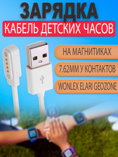 Магнитная зарядка USB кабель для смарт- умных- детских- GPS- часов Smart Baby Watch (4 pin 7,62 mm). Универсальное зарядное устройство подходит для большинства умных детских смарт часов с расстоянием между контактами - 7,62 миллиметра. Совместимо с часами таких брендов как: ELARI, Aimoto, GEOZON, JetKids, Wonlex, ProLike, Tiroki, Find My Kids НЕ подходит для моделей ELARI: KidPhone 3G, FixiTime 3, KidPhone 4GR ! внимание! Обязательно перед покупкой необходимо замерить расстояние между контактами на ваших часах, это основной параметр который отвечает за то что зарядное устройство подойдет к вашей модели. Так же обратите внимание, что зарядное устройство универсальное и не дает 100% гарантии, что будет работать со всеми моделями часов с таким расположением контактов, так как у некоторых часов может иначе располагаться + и -, или может быть другая полярность на магнитах.