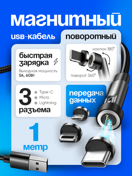 Магнитный кабель: удобство и функциональность Представляем вам зарядный магнитный кабель 3 в 1 — незаменимый аксессуар для вашего телефона, ПК или другого устройства. Этот шнур обеспечивает быструю и удобную зарядку, а также передачу данных между гаджетами. Максимальный выходной ток достигает 5 А, что позволяет заряжать смарт устройства по интерфейсу заряда USB2.0 и 3.0. Основные преимущества: - Универсальность. Наш шнур подходит для различных типов электроники, включая телефоны Samsung (самсунг), Xiaomi (ксиаоми), Huawei и т. д. на базе Android (андроид) и iPhone (айфоновский айфон) с различными разъемами (micro USB (микро юсб), Type-C (тайп си тайпси) и Lightning (лайтнинг) ). Это делает его идеальным выбором для широкого круга пользователей. - Удобство использования. Благодаря магнитной конструкции, зарядник легко подключается и отключается, что предотвращает повреждение разъемов. Намагниченный наконечник крутится на 180 градусов. Это особенно полезно при работе с портативными гаджетами. Длина провода составляет 100 см - 1 метр. - Быстрая зарядка. Поддерживает быструю зарядку, что позволяет быстро зарядить ваш телефон. Это удобно в повседневной жизни и в поездках. - Передача данных. Кроме зарядки, также позволяет передавать данные между устройствами с высокой скоростью до 480 Мб/с, что делает его универсальным аксессуаром. - Прочность и долговечность. Изготовленный из качественных материалов, наш сетевой кабель обеспечивает стабильную работу и долгий срок службы более 30000 изгибов. Соединитель провод станет незаменимым помощником для вас. Он обеспечит удобство использования, быструю зарядку и передачу данных, а также защитит ваши устройства от повреждений. Этот аксессуар идеально подойдет как для домашнего использования, так и для работы или путешествий. Вы можете быть уверены в качестве и надежности нашего кабеля.