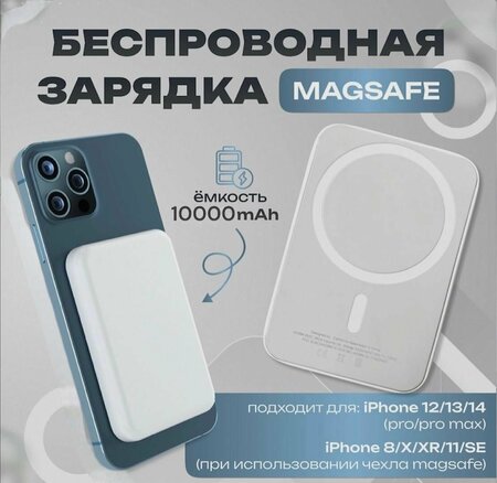 Внешний аккумулятор с беспроводной зарядкой с дизайном apple, это современный девайс, очень удобный, компактный и не занимает много места, . Данный девайс позволяет вам прикрепить его к вашему apple смартфону, который имеет функции беспроводной зарядки. Powerbank магнитится к задней панели вашего смартфона и не мешает его использованию при одновременной зарядки. Устройство можно использовать как переносной powerbank а также можно использовать в качестве стационарного беспроводного зарядного устройства, который вы можете подключить к сети и оставить в любом удобном для вас месте. MagSafe Пауэрбанк, удобный, компактный, минималистичный, универсальный powerbank на 5 000 мАч, всегда можно взять с собой в путешествия и в длительные поездки. Повербанк для айфона очень легкий и компактный, дети школьники могут его носить с собой, и всегда оставаться на связи, заряжая свои любимые гаджеты. Беспроводное зарядное магнитное устройство для Apple практичный, красивый и полезный подарок к любому поводу - день рождения, день студента, выпускной, 8 марта, 23 февраля, новоселье или для путешествия. Рекомендуется: Адаптер питания USB-C мощностью 20 Вт или выше и кабель USB C/Lightning (продаются отдельно). До 40% дополнительного заряда при использовании MagSafe Battery Pack с iPhone 12 mini или iPhone 13 mini*До 30% дополнительного заряда при использовании MagSafe Battery Pack с iPhone 12 или iPhone 13*До 30% дополнительного заряда при использовании MagSafe Battery Pack с iPhone 12 Pro или iPhone 13 Pro*До 30% дополнительного заряда при использовании MagSafe Battery Pack с iPhone 12 Pro Max или iPhone 13 Pro Max* Если модель Вашего телефона не имеет встроенных магнитов (до 12 модели iPhone), то для крепления аккумулятора используйте чехол MagSafe.