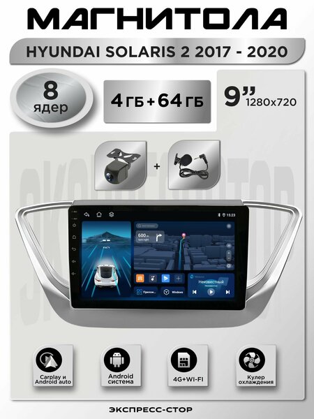 Автомагнитола 8-ми ядерная с сенсорным экраном 9 дюймов для Hyundai Solaris 2 2017, 2018,2019,2020 (Хундай Солярис 2) Поставляется полный установочный комплект. Магнитола для авто представляет собой инновационное мультимедийное устройство, предназначенное для установки в штатное место автомобиля. В основе андройд магнитолы лежит 8 ми ядерный процессор , который обеспечивает высокую производительность и позволяет выполнять несколько задач одновременно без потери скорости. На автомагнитоле андроид возможно хранить большое количество аудио-и видеофайлов, а также приложений благодаря оперативной памяти 4 ГБ и встроенной памяти 64 гб. Магнитола 9 дюймов с сенсорным , QLED-экраном с разрешением 1280×720 пикселей обеспечивает яркое и чёткое изображение, делая просмотр видео и навигацию более комфортными. Автомагнитола 2 din оснащена музыкальным усилителем DSP, что гарантирует качественное звучание, расширенные возможности настройки звука и отличную работу с аудиофайлами. В магнитоле Хендай Солярис 1 установлен GPS навигатор. Любое навигационное приложение можно установить через Google play. В магнитоле для автомобиля есть возможность разделения экрана для использования двух приложений одновременно. Магнитола на хендай солярис 2 имеет регулируемый кулер охлаждения. В магнитоле андройд также предусмотрен слот для установки SIM-карты, обеспечивающий быстрое и стабильное соединение с интернетом. Кроме того, в ней встроен модуль Wi-Fi, подключение к сети интернет происходит путем раздачи точки доступа с вашего телефона. В комплекте с магнитолой поставляется антенный усилитель. Подключайте к автомагнитоле android, смартфон по Bluetooth для громкой связи, передачи музыки, и управления мультимедиа. В магнитоле с bluetooth, CarPlay и Android Auto - работают по беспроводной сети и передают часть информации со смартфона на устройство в автомобиле. Повысьте уровень безопасности и удобства с помощью камеры заднего вида и выносного микрофона, которые идут в подарок к магнитоле. Также к магнитоле 2 din 9 дюймов можно подключить камеру переднего вида, видеорегистратор, сабвуфер, усилитель звука, кнопки на руле. В комплект входят: восьмиядерная магнитола, переходная рамка, два USB-порта, GPS-антенна, 4G-антенна, RCA-разъём, выносной слот под SIM-карту, выносной микрофон и камера заднего вида.