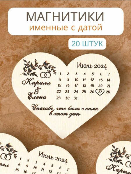 В комплекте 20 магнитиков с индивидуальным нанесением ваших имён и даты. ! Пожалуйста внимательно прочитайте инструкцию. После заказа обязательно отправьте нам сообщение содержащее: 1. Номер вашего заказа. 2. Ваши имена и дату. Чтобы отправить данные Вам необходимо найти нас через синюю социальную сеть по названию нашего магазина "Свадьбатека" и прислать все данные в сообщении. Магнитики с индивидуальной гравировкой имён и даты вашей свадьбы - символичный памятный подарок для ваших близких. Магнитики делаются из прочного материала - берёзовой фанеры. В сравнении с магнитиками из искусственного материала наши экологичны, приятны на ощупь своей текстурой, рельефностью. Их запах не оставит равнодушным никого Мы любим наших клиентов и делаем только качественный товар. Поэтому не используем магнитные ленты, которые громоздки и портят внешний вид, не делаем как другие… В создании наших магнитиков участвуют только неодимовые магниты, которые славятся своей мощностью и компактными размерами. Подарок от молодожёнов должен быть качественный/красивый. Всё должно быть идеально, поэтому магнитики из дерева сделаны на высоком уровне. Каждый магнитик будет находиться в индивидуальной прозрачной упаковке. Это прекрасный свадебный презент для гостей. Размер каждого магнита 8х6 см Материал: березовая фанера и неодимовый магнит