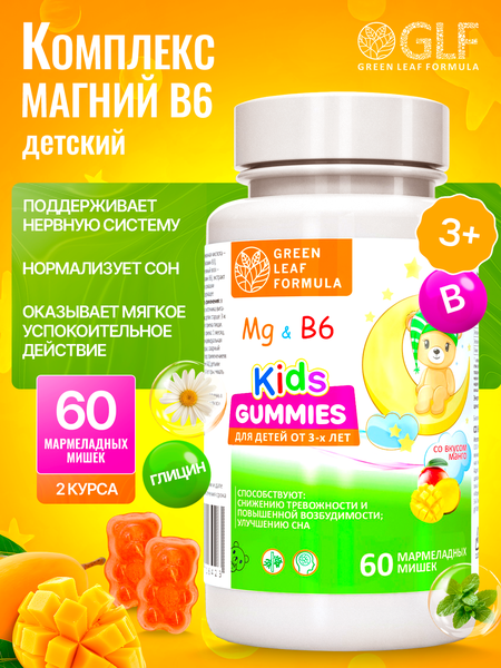 Детский витаминно-минеральный комплекс Магний В6 “Спокойствие Гамми” со вкусом манго - это жевательные мармеладки с магнием, глицином, витаминами В3 и В6 и экстрактами трав для поддержания спокойствия ребенка и улучшения качества его сна. Мишки Гамми удобно принимать и жевать детям с 3-х лет 1 раз в день. Пастилки очень нравятся детям и приносят не только удовольствие, но и большую пользу организму. Витамины для детей оказывает следующее действие: - Устраняет дефицит магния. - Помогает ребенку при повышенных физических, умственных и эмоциональных нагрузках. - Снижает раздражительность и бережет нервную систему. - Нормализует и поддерживает здоровый сон. - Снимает мышечные спазмы и судороги. - Снижает нервозность и защищает от стресса. - Оказывает мягкое успокаивающее действие. - Поддерживает здоровье сердечно-сосудистой системы. - Улучшает работу ЖКТ. Магний цитрат оказывает поддержку нервной системе при нервном напряжении, депрессиях и стрессе, поддерживает здоровья сердечно-сосудистой системы, нормализует сон, снимает мышечные спазмы, помогает при головных болях и мигренях. Витамины группы В необходимы для нормального функционирования центральной и периферической нервной системы, улучшают всасывание магния из желудочно-кишечного тракта и его проникновение в клетки. Глицин оказывает успокаивающее действие на нервную систему в период высоких эмоциональных нагрузок и переутомления, выступает как антистрессовый компонент, помогает нервной системе более сдержанно реагировать на внешние возбудители, снижая проявление агрессии, конфликтности, раздражительности. Экстракты листьев мяты перечной и мелиссы оказывают сосудорасширяющее, мягкое успокаивающее действие, способствуют улучшению качества сна и нормализации сердечного ритма. Экстракт ромашки улучшает работу жкт, оказывает спазмолитическое и мягкое успокаивающее действие.
