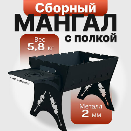 Мангал с полкой складной, толщиной 2 мм. Высота 33 см, Глубина 30 см, Ширина 40 см. Представляем Вам прочный, надёжный многоразовый сборно-разборный стальной мангал, который станет незаменимым помощником в приготовлении шашлыка. Мангал состоит из 5 частей. Он легко за 30 секунд собирается и разбирается в очень устойчивую конструкцию. Для сборки не требуется инструмента. Разборная конструкция позволяет мангалу быть компактным и мобильным, удобна для перевозки в багажнике автомобиля, а при хранении такой мангал не занимает много места. Размеры в разобранном виде: высота всего 2 см, ширина 32 см, длина от 40 см. Идеальный набор для путешествий, а также для охотника или рыбака. Мангал легко взять с собой на природу, пикник, кемпинг, озеро или перемещать его на своём участке. Вы можете использовать его для жарки шашлыков и овощей на шампурах или решетке, а так же мяса на гриле и барбекю или приготовления блюд в чугунном казане. Это будет отличный подарок для мужчины, друга, мужа, папы, сына, брата, дедушки, начальника, коллеги на день рождения, юбилей, 14 февраля, 23 февраля, 9 мая, новоселье, новый год. Мужчины по-настоящему оценят такой приятный сюрприз. Конструкция мангалов позволяет одновременно использовать 6 шампуров. Специальные вырезы под шампуры в виде утиной лапки делают процесс жарки более комфортным. Каркас мангала не покрыт термостойкой краской, так как любая краска со временем слезет из-за достигаемой температуры. Складной многоразовый мангал хорошо подходит для профессионального использования, кемпинга, барбекю. Мангал довольно устойчивый не требует дополнительных подпорок. Гарантируем качество наших изделий!