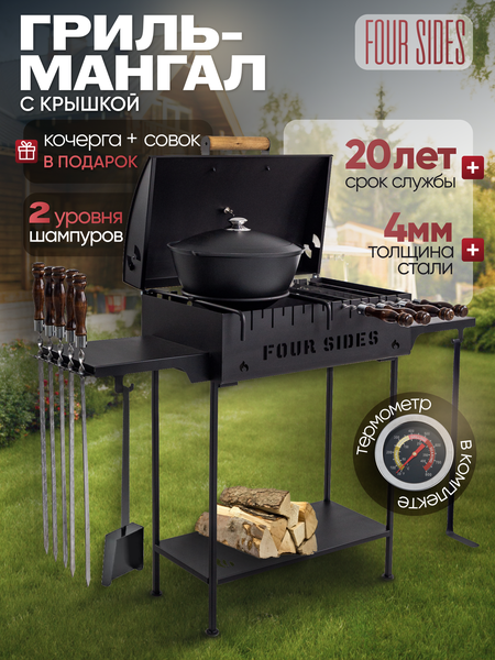 Мангал-гриль — это универсальное комплексное решение для приготовления различных блюд на огне, углях или в казане. Совок и кочерга в подарок при заказе! Мангал выполнен из котловой стали 09Г2С толщиной 4 мм. Уникальность изделия заключается в том, что чаша мангала выполнена из цельного металлического листа толщиной 4 мм. Она имеет сплошные сварочные швы только с торцов, поэтому форма не меняется от воздействия огня даже после длительного использования. Технология производства и сварки, которая есть только у нашего бренда, продлевает срок службы мангала до 20 лет. Жаровня 4 мм и остальные части покрыты огнестойким антикоррозийным покрытием, которое выдерживает температуру до 1200 градусов и значительно увеличивают срок службы мангала на долгие годы. Мангал гриль позволяет готовить блюда, требующие длительного и равномерного приготовления. Это возможно благодаря многофункциональной крышке с регулировкой температуры прожарки. Специальные заслонки регулируют необходимый уровень. А с помощью термодатчика можно следить за температурой внутри. Вместимость жарочной поверхности мангала позволяет готовить сразу на 9 шампурах. Высота на ножках оптимальна, составляет 75 см и подойдет практически для каждого. Специальные вырезы для шампуров в 2 уровня делают процесс приготовления шашлыка еще более комфортным. Мангал барбекю хорошо поддерживает жар, не требуя большого количества углей или дров из-за отверстий для циркуляции воздуха. Боковые полки предназначены для размещения посуды или других предметов в доступном месте. На дровнице удобно размещать дрова, уголь или другие предметы. Рекомендации по уходу за мангалом для отдыха: не хранить под осадками и в помещении с повышенной влажностью, не мыть. Данный мангал входит в линейку мангалов с зарегистрированным товарным знаком FOUR SIDES на территории России. Мы Российская компания с собственным производством высококачественных мангалов.