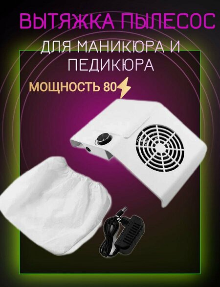 Профессиональный мощный настольный пылесос для маникюра и педикюра мощностью 80 ватт с регулятором мощности выполнен из высококачественного пластика, поверхность корпуса можно протерать влажной салфеткой. Пылесос предназначен для поглощения пыли образующейся в результате спиливания геля, гель лака, очень удобен и прост в применении. В комплекте 1 многоразовый мешочек-пылесборник . Компактный пылесос для маникюра устанавливается на столе возле мастера и незаметно всасывает всю пыль, благодаря чему мусор не будет подниматься в воздух, попадать в дыхательные пути или портить накрашенные ногти. Удобная практическая подставка под руки. Данный аппарат подходит как для профессионального, так и для домашнего использования. Пылесос-подставка предназначен для эффективного сбора опила во время процедуры маникюра и педикюра. Пылесос оснащен мощным вентилятором, который убирает даже самые маленькие пылинки.