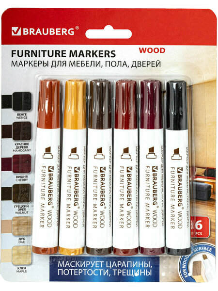 Набор маркеров для ремонта мебели и изделий из дерева BRAUBERG WOOD — это идеальное решение для маскировки царапин и сколов на мебели, напольных покрытиях и дверях. Эти маркеры, доступные в 6 цветах, включая венге и вишню, легко подбираются к любому дереву. Уникальный дизайн с скошенным наконечником позволяет наносить краску со штрихом от 1 до 5 мм, что делает их универсальными. Специальная спиртовая основа обеспечивает быструю сушку и устойчивость к воде, УФ-излучению и температурным изменениям, что делает их идеальными для ремонта и декорирования. Кроме того, эти маркеры отлично подходят для скрапбукинга и декоративного рисования, предлагая гибкость в использовании, будь то маркер для скетчинга или маркер для ткани. Плотно закрывающийся колпачок предотвращает высыхание, а цвет колпачков соответствует чернилам, обеспечивая легкость в выборе нужного оттенка. Используйте маркеры BRAUBERG WOOD для быстрого и качественного ремонта, добавляя не только функциональность, но и стиль в ваш интерьер. • Тип товара: маркер. • Серия: WOOD. • Цвет: венге, красное дерево, вишня, грецкий орех, дуб, клен. • Толщина линии: 1-5 мм. • Быстросохнущие чернила: да. • Количество цветов в комплекте: 6 шт. • Состав: спиртовая основа. • Упаковка: блистер с европодвесом. • Артикул производителя: 152203.
