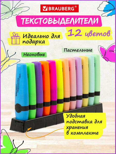 Набор текстовыделителей BRAUBERG "DELTA" — это незаменимый инструмент для тех, кто стремится к организованности и эффективности. Включая 12 цветов, этот комплект идеально подходит для выделения текста на бумаге любого типа, включая факс-бумагу. В наборе представлены шесть неоновых и шесть пастельных цветов: фиолетовый, голубой, зеленый, желтый, оранжевый, розовый, лавандовый, бирюзовый, мятный, ванильный, персиковый и пастельный розовый, что делает их идеальными маркерами для рисования и работы с документами. Корпус текстовыделителей имеет овальную форму, что обеспечивает удобство использования, а скошенный наконечник позволяет варьировать толщину линии от 1 до 5 мм, что подходит для работы с мелким шрифтом и таблицами. Чернила на водной основе предотвращают высыхание без колпачка в течение 8 часов, обеспечивая экономный расход и предотвращая размазывание. Цвет корпуса соответствует цвету чернил, что облегчает выбор нужного текстовыделителя. Этот набор фломастеров и маркеров выделителей станет незаменимым элементом вашей канцелярии и офисных принадлежностей, помогая вам эффективно организовать рабочее пространство. • Цвет чернил: ассорти. • Количество в комплекте: 12 шт. • Форма наконечника: скошенный. • Спецэффект цвета чернил : неоновый, пастельный. • Основа чернил: водная. • Серия: Delta. • Мин. толщина линии письма: 1 мм. • Макс. толщина линии письма: 5 мм. • Форма корпуса: овальная. • Диаметр корпуса: 25 мм. • Упаковка: пластиковый футляр с европодвесом. • Артикул производителя: 151737.