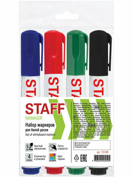 Набор стираемых маркеров STAFF "Manager" — идеальное решение для всех, кто ищет качественные письменные принадлежности для офисных или образовательных нужд. Эти маркеры для белой доски представлены в четырех ярких цветах: черном, красном, синем и зеленом, что позволяет создавать заметные и выразительные записи. Толщина линии в 5 мм делает их отличными для четкого письма, что особенно удобно при использовании на досках с магнитно-маркерной поверхностью. Благодаря специальной спиртовой основе, чернила быстро высыхают и не оставляют разводов, а легкость стирания с помощью сухой губки делает использование этих маркеров удобным. Кроме того, круглый пластиковый корпус и цветные колпачки соответствуют цвету чернил, что добавляет эстетичности. Эти фломастеры идеально подходят не только для работы, но и для рисования, а также для уроков в школе. Выберите набор маркеров для создания живых и запоминающихся записей, которые всегда будут под рукой. • Цвет: ассорти. • Серия: Manager. • Толщина линии письма: 3,5, 4, 5 мм. • Наконечник: круглый. • Количество в комплекте: 4 шт. • Основа чернил: спиртовая. • Чернила стираются сухой губкой: да. • Не протекает при перепаде давления: да. • Наличие клипа на колпачке: да. • Материал корпуса: пластик. • Артикул производителя: 151495.