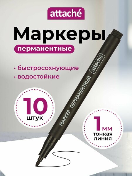 Перманентный маркер разработан специально для того, чтобы записи и рисунки оставались яркими и заметными на протяжении долгого времени. Нестираемый фломастер помогает с легкостью справиться с различными задачами. Отличается высокой светостойкостью и водостойкостью. Его спиртовая формула и быстросохнущие свойства обеспечивают мгновенную фиксацию на поверхности, предотвращая размазывание. Универсальный фломастер пригодится в промышленности, в офисе и дома в быту, для письма и рисования. Профессионалы смогут использовать его для создания надписей на металле (даже на котором есть загрязнения), картоне, бетоне и ткани. А еще он замечательно подойдет для творчества, нейрографики и работы с различными поверхностями. Например, с ним можно наносить маркировку на стекло, пластик, дерево, керамику, кафель и пленку. Такое изделие является идеальным инструментом для творчества. Минимальная толщина линии письма – 1 мм, максимальная – 1 мм. Форма наконечника несмываемого маркера – круглая. Обратите внимание! В наборе 10 штук. Цвет – черный.