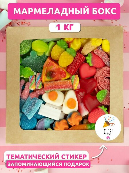 Жевательный мармелад кислый и сладкий, бокс содержит около 45 видов свежего мармелада. Находится в подарочной герметичной упаковке, где сладости сохранят свежесть и мягкость длительное время. А тематические стикеры добавят эмоций и предназначению вашему сюрпризу. Подходят для маленького перекуса в дорогу, во время игры, на прогулке, а также к чаю. Полезный продукт упакован в крафт коробку с окном. Наш десерт из самых разных стран Испания, Италия, Турция и многие другие. Мармеладный детский набор содержит ассорти разных видов и вкусов- фрукты, кока кола, малина, вишня, ягоды, клубника, яичница, мишки, кусочки пицца, кислая лента, ананас, акулы, манго, лягушки, арбуз и многие другие вкусные и оригинальные виды. Вкусные подарки и десерты любят все, Вы можете смело заказывать испанский фигурный мармелад для детей и взрослых. Оригинальный подарок девочке и мальчику, женщине и мужчине. При отправке вашего бокса с вкусняшками он тщательно упаковывается в транспортную коробку. Срок годности мармеладок: 1 год. Внимание! Содержимое бокса может незначительно отличаться от фота. Европейский мармелад имеет огромную пользу в виде источника коллагена (как в желе) ведь в его состав входит агар агар и натуральный сок, витамины и пектин, а ещё он является полезной альтернативой шоколад и сахару. Соответствует всем стандартам Халяль. Данный подарок станет идеальной дополнением для подарочка в виде детской игрушки. Не забывайте, что это полезный пп продукт с низким количеством калорий, а значит можно совмещать полезное, здоровое и вкусное вместе. Сладость из Европы, это отличное угощение подруге, мужчине, маме и папе, а также парню или девушке. Чудо желатинки (мармеладки) могут помочь в борьбе с никотиновой зависимостью, а также станут полезным продуктом питания для женщин. Отлично дополняет наше сладкое творение это менажница пастилы и зефир. Если хотите удивить своих близких купите наш Испанский продукт, а чтобы порадовать взрослых и детей, закажите необычный и прикольный бокс на праздник, девушке на 14 февраля и без повода, сестре на 8 марта, на 1 сентября, другу на день рождения, брату на 23 февраля, ребенку, учителю, воспитателю, подростку, девочке, мальчику, сыну, дочке, внуку, мужу, на выпускной, семье, бабушке, школьникам, в школу, в садик, матери, на день влюбленных. Мармеладыч. Мармеладные кисло-сладкие конфеты станут классной идей и приколы на хэллоуин (хеллоуин) благодаря своим формам, как червячки, зубы, дольки, радуга, ленточки, в виде фруктов, лягушки, фигурный, ягоды, виноград, животные. Наш мармелад очень похож с мармеладом беренда haribo, cola