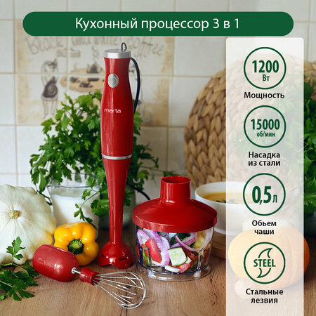 Мощный кухонный процессор со съемным пластиковым блендером позволяет легко смешивать, измельчать и взбивать продукты, добиваясь их однородности и нужной консистенции. Все необходимые аксессуары уже в комплекте: - венчик для взбивания, - пластиковая насадка блендер со стальными лезвиями, - измельчитель с ёмкой прозрачной чашей. Лезвия насадки изготовлены из высококачественной пищевой нержавеющей стали, что обеспечивает простейший уход за прибором и его безотказную работу. Они не деформируются, не подвержены коррозии и имеют максимально длительный срок службы. Съемная насадка-венчик подходит для смешивания жидкостей, замешивания теста, взбивания яиц и крема. Измельчитель с лезвиями из нержавеющей стали и прозрачной чашей подходит для измельчения, взбивания, смешивания, приготовления большинства продуктов, в том числе фарша. Кухонный процессор предназначен для легкого и быстрого приготовления самой разнообразной пищи, измельчения, взбивания и смешивания различных продуктов до однородной массы. С его помощью можно приготовить ароматные супы-пюре и соусы, разнообразную выпечку, десерты, взбитые сливки, крем и мороженое, полезные фруктовые и овощные муссы, смузи и коктейли. Благодаря его использованию, Вы сможете включить в свой рацион больше свежих и полезных блюд. Кухонный процессор Marta удобен и прост в использовании, легко впишется в дизайн любой кухни, не занимая много места и при этом всегда оставаясь под рукой. Мощность 1200 Вт - (максимальная мощность мотора при блокировке двигателя).