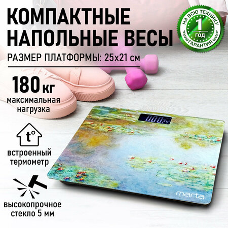 Весы напольные электронные стеклянные с термометром MARTA 25*21 см. Компактные и не занимают много места. Электронные весы с платформой из полированного стекла. Встроенная функция индикации температуры помещения и крупный жидкокристаллический дисплеем с легко читаемыми цифрами. Обеспечивают взвешивание до 180 килограммов с точностью до 50 граммов. Благодаря разнообразию расцветок и привлекательному дизайну весы легко впишутся в любой интерьер. Дисплей ЖК. Диапазон измерений 5-180 кг. Максимальная нагрузка 180 кг. Точность измерения 50 г. Индикация заряда батареи, Индикация перегрузки, Измерение температуры воздуха, Режимы только масса тела, Изменение единиц измерения кг/фунты, Светящиеся символы дисплея, Размер дисплея 24х60 мм, Тип элементов питания AAA, Количество элементов питания 2, Напряжение элементов питания 1,5 В, С рисунком на корпусе, Автоматическое включение, Автоматическое выключение, Материал платформы стекло. Электронные напольные весы с платформой из полированного стекла, встроенной функцией индикации температуры помещения и крупным жидкокристаллическим дисплеем с легко читаемыми цифрами. Обеспечивают взвешивание до 180 килограммов с точностью до 50 граммов. Благодаря разнообразию расцветок и привлекательному дизайну весы легко впишутся в любой интерьер.