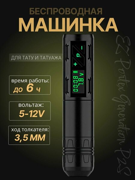 EZ Portex Generation 2S или по простому, EZ P2S - это беспроводная тату-машинка на аккумуляторе от EZ Tattoo. Одна из самых популярных беспроводных моделей тату машинок на российском рынке! Эта машинка зарекомендовала себя как отличный инструмент для начинающих татуировщиков, которые только начинают свой путь, до высококлассных мастеров тату и перманентного макияжа! Такую популярность машинка заслужила своей простотой и доступной ценой! Сердце машинки - мотор от EZ собственного производства. Машинка поворотник с эксцентриком 3.5мм, что придаёт ей мягкости в работе и подходит для большинства стилей художественной татуировки. Аккумулятор EZ P2S имеет ёмкость 1800mAh, что покажется не так много, но по факту, время работы на одном заряде может составлять до 6 часов! Среднее время работы на одном, полностью заряженном аккумуляторе 4-6 часов работы. Машина оснащена дисплеем, на который выводиться информация о рабочем напряжении, времени работы и уровене заряда аккумулятора. Аппарат для татуажа и перманентного макияжа эргономичен и компактен, что обеспечивает свободу действий в создании татуировки на любом месте. Ширина держателя стандартная - 32мм, на которые отлично наматывается барьерная защита в виде эластичного бинта (боксерского бинта) или любой другой барьерной защитой. Время зарядки аккумулятора примерно 2 часа. Благодаря своим размерам, к ней идеально подходит барьерная защиты форм-фактора Pen (Пэн). На держателе цилиндрической формы, отлично будет фиксироваться бандажный бинт. Беспроводная тату машинка - это Ваша мобильность и лёгкость! Забудьте про RCA провода и дорогущие блоки питания Critical. Все отправляемые нами машинки проходят проверку на брак, тщательно упаковываются и заряжаются. Мы следим за своей репутацией! Гарантия 6 месяцев.