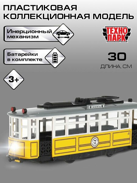 Металлическая модель «Ретро-трамвай» ТМ «Технопарк» - прекрасный подарок для ребёнка: - световые эффекты - звуковое сопровождение - открываются двери - токоприёмники поднимаются и опускаются - инерционный механизм (поставьте трамвай на ровную поверхность, потяните за корпус назад, отпустите - и он начнёт быстро двигаться вперёд) Металлическая модель, выполненная с учётом всех особенностей прототипа, обязательно понравится вашему ребёнку. Благодаря открывающимся дверям, которые делают трамвай максимально похожим на настоящий, всегда можно заглянуть к нему внутрь, чтобы убедиться - каждая деталь отлично проработана. Реалистичный дизайн данной модели плюс световые и звуковые эффекты позволят с головой погрузиться в игру, придумывая новые интересные сюжеты. Кроме того, эта игрушка познакомит малыша с видами общественного транспорта. Игра с инерционной моделью ТМ «Технопарк» развивает: - координацию движений - внимание - ловкость - фантазию и воображение Длина модели: 17 см. Материал: металл + пластмасса. Работает от 3-х батареек типа LR41 (в комплекте). Рекомендовано детям от 3-х лет.