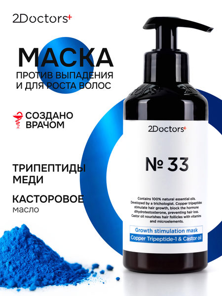 Проверенный продукт. Маска бальзам с трипептидами меди от 2Doctors - это высокоэффективный комплекс из природных компонентов разработан врачом дерматологом, имеющим стаж врачебной деятельности более 20 лет. Уникальная формула средства не имеет аналогов в России и содержит максимальную концентрацию действующих ингредиентов, стимулируя рост новых волос. В случае нехватки в организме меди и аминокислот эффективно помогает решить проблему выпадения волос, благоприятно влияет на кожу головы. Подходит для женщин и мужчин с любым типом волос. Помогает решить проблему выпадения волос. Грамотно подобранный состав •Трипептиды меди блокируют негативное влияние гормона дигидротестостерона на волосяной фоликул, препятствуют чрезмерному выпадению волос, стимулируют синтез коллагена, гликозамингликанов (влагоудерживающих молекул дермы), участвуют в процессе ремоделирования кожи (регулируют ферментативную систему, ускоряя распад ненужных компонентов и блокируя разрушение матрикса кожи), «будят» стволовые клетки, повышают уровень антиоксидантов и уменьшают уровень воспалительных цитокинов • Касторовое масло питает волосяные луковицы витаминами и микроэлементами, укрепляет волосы • Эм вербены усилит кровоток в коже и улучшит транспортировку полезных веществ • Отвар календулы обеспечит увлажнение для волос, подействует как профилактика от перхоти • Отвар чистотела поможет усилит действие против выпадения волос Продукты имеют декларацию о соответствии. Бесплатно консультируем покупателей по подбору наших средств. На вопросы покупателей отвечает сам производитель. Всегда рады видеть Вас в нашем магазине!