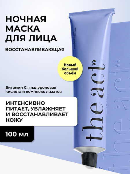 Ночная маска для лица The Act глубоко питает и увлажняет кожу во время сна. Ночью кожа активнее восстанавливается и лучше впитывает полезные вещества. Это идеальное время для интенсивного ухода. Маска для лица The Act с активным комплексом для ночного восстановления помогает подготовить кожу к следующему дню, придавая ей отдохнувший и сияющий вид. Богатый питательный состав восстанавливающей маски заботится о красоте и сиянии кожи. Витамин С защищает от свободных радикалов, стимулирует выработку коллагена, повышает упругость, осветляет и выравнивает тон кожи. Сквалан укрепляет гидролипидную мантию, предотвращает потерю влаги, борется с раздражениями, совершенствует тонус и микрорельеф кожи. Комплекс лизатов поддерживает баланс микрофлоры, восстанавливает функции кожи, препятствует размножению патогенных микроорганизмов. Экстракты центеллы азиатской, ягод годжи и коры ивы замедляют процессы старения, обеспечивая лифтинг-эффект. Оживляют тусклую кожу, улучшают цвет лица и создают матовый эффект, стягивая поры. Гиалуроновая кислота увлажняет, улучшает текстуру кожи, сокращает мелкие морщины и делает кожу гладкой и нежной. Активный ночной комплекс с экстрактом лаванды способствует повышению выработки мелатонина, ресинхронизирует циркадные ритмы кожи, уменьшает воспаление и покраснения кожи, помогает подготовить кожу к следующему дню, придаёт отдохнувший и сияющий вид, повышает барьерную функцию кожи Как применять маску? Равномерно нанесите средство на кожу лица и шеи, оставьте на ночь и смойте остатки утром. Рекомендовано к применению с 14 лет.