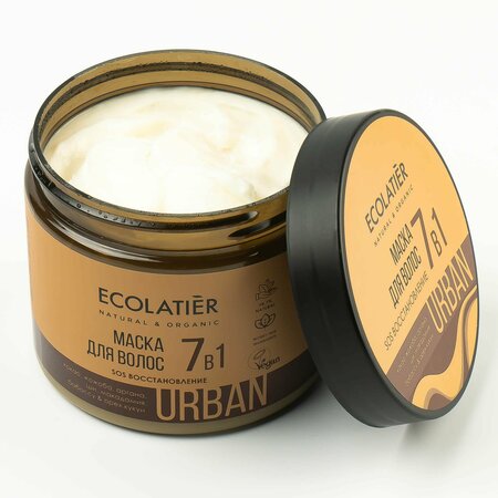 Интенсивно восстанавливающая маска 7 в 1 ECOLATIER URBAN, благодаря входящим в состав натуральным ингредиентам, заботится о волосах, глубоко питает и моментально восстанавливает, делает их мягкими и шелковистыми. АКТИВНЫЕ ИНГРЕДИЕНТЫ: Масло арганы защищает волосы от воздействия неблагоприятных факторов, интенсивно увлажняет, восстанавливает структуру волос, делая их более сильными и блестящими. Масло ши питает волосяные фолликулы, прекрасно ухаживает за волосами, делает их сильными и здоровыми. Масло какао благотворно влияет на волосы и кожу головы, обладает выраженными антиоксидантными и восстанавливающими свойствами. Восстанавливает структуру, заметно улучшает состояние волос и внешний вид. Защищает от вредного УФ излучения. Масло жожоба моментально улучшает качество волос, восстанавливает их эластичность и прочность. Устраняет пористость и сухость волос, избавляет от тусклости и секущихся кончиков, делает волосы гладкими и блестящими. Масло макадамии глубоко насыщает волосы полезными веществами, витаминами и живительной влагой. Масло бабассу благоприятно воздействует на кожу головы, устраняет сухость и зуд. Сок дерева Кротон Лехлера (Кровь Дракона), экстракт моринги, витамины В5, В6, С, Е стимулируют детокс клеток, регенерируют кожу, проявляют высокую антиоксидантную активность и улучшают барьерные функции кожи. Масло кукуи хорошо проникает в структуру волос и кожу головы, быстро впитывается, без ощущения маслянистой пленки. Сохраняет гидро-липидный баланс и предотвращает потерю влаги. Результат: волосы моментально становятся блестящими, мягкими и послушными.