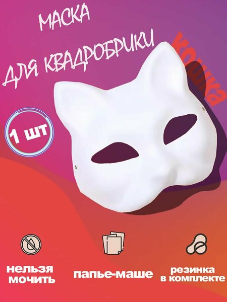 Маска для квадробики кошка, создаст уникальный образ для любого праздника или мероприятия. Карнавальная маска в виде кошечки-идеальный вариант для юного художника. Размер универсальный и подойдет под любую форму головы. Она изготовлена из папье-маше, очень легкая и идеальна для раскрашивания. В наборе два исходных товара: японская маска с ушками -1 штука для декорирования и 1 резинка для крепления. Благодаря чему, она идеально будет фиксироваться на голове, не сковывая движения и не вызывая дискомфорт как для детей, так и для взрослых. Декорирование масок из папье маше способствует развитию творческого мышления, фантазии и мелкой моторики. Это отличная идея для творчества и уникальная возможность сделать такую маску, которую хочется именно Вам. Маска белого цвета, что является отличной основой для этого. Вы или Ваш ребенок может раскрасить ее всеми видами красок, декорировать блестками, перьями, цветами или стразами. Готовую яркую маску для квадробики можно надеть на день рождения, утренник или маскарад в виде украшения. Благодаря такому изделию Вы еще больше сблизитесь с ребенком и весело сможете провести время, наблюдая за увлекательным процессом. Рисуйте и творите с удовольствием с нашим комплектом для творчества. Выбирайте маску для раскрашивания и проводите время вместе со своими детьми и семьей.