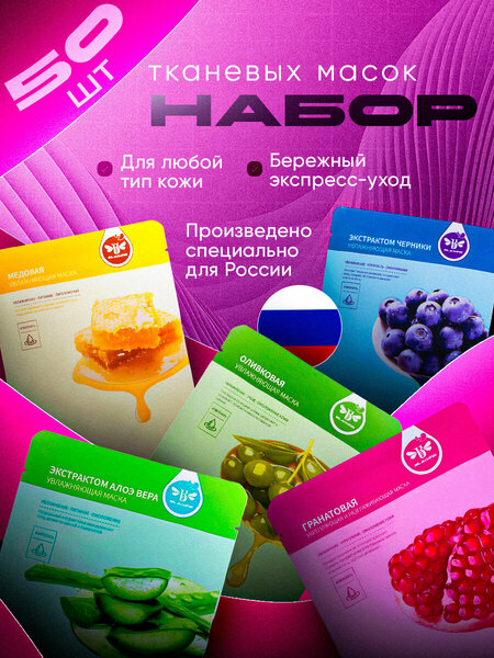 Маска для лица тканевая набор BLAISINE / уходовый набор тканевых масок для лица 50 штук