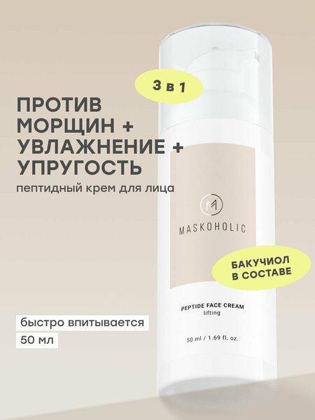 Омолаживающий пептидный крем с бакучиолом от Maskoholic стимулирует выработку коллагена, уменьшает морщины и признаки старения. В составе — 8 активных компонентов и комплекс экстрактов, которые обеспечивают выраженный эффект лифтинга. Одна из причин старения — сухость, поэтому увлажняющий крем для лица также работает как питательный крем для лица, делая кожу более упругой и гладкой. Это универсальный крем для лица антивозрастной и увлажняющий одновременно. Вам полезен крем, если: – беспокоят морщины и признаки старения – ощущается недостаток увлажнения кожи – кожа теряет упругость, тонус и эластичность Что делает крем? – разглаживает морщины и укрепляет кожу – действует как увлажняющий крем и повышает эластичность – активирует выработку коллагена – возвращает коже гладкость и упругость За счёт чего работает? 1 / Пептиды стимулируют синтез коллагена и сокращают морщины 2 / Бакучиол уменьшает проявления возраста 3 / Ниацинамид для лица улучшает цвет и увлажнённость 4 / Токоферол сохраняет гладкость 5 / Аденозин активизирует обновление кожи 6 / Аллантоин и пантенол ускоряют восстановление 7 / Гиалуроновая кислота обеспечивает стойкое увлажнение лица 8 / Комплекс экстрактов — защита и комфорт Как пользоваться? 1 / Нанести круговыми движениями на чистую кожу лица, шеи и декольте 2 / Использовать утром и вечером 3 / Отлично работает как дневной крем для лица и крем под макияж 4 / Совместим с другими средствами ухода 5 / Подходит для всех типов кожи, включая сухую 6 / Может применяться как мужской крем для лица в антивозрастном уходе Какой результат? Кожа увлажнена, напитана, морщины сокращены, тон лица выровнен. Идеальный крем для лица увлажняющий женский и универсальный для любого типа кожи. Maskoholic. Мечтать вам к лицу.